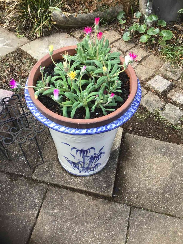 リビングストーンデージ🌼🌸🌺を 植えて、 高さのある鉢に ポンと乗せて