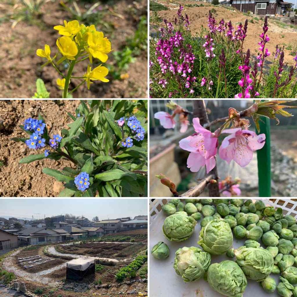 菜花、姫金魚草、勿忘草、河津桜、おまけに芽キャベツ最後の収穫です☺️