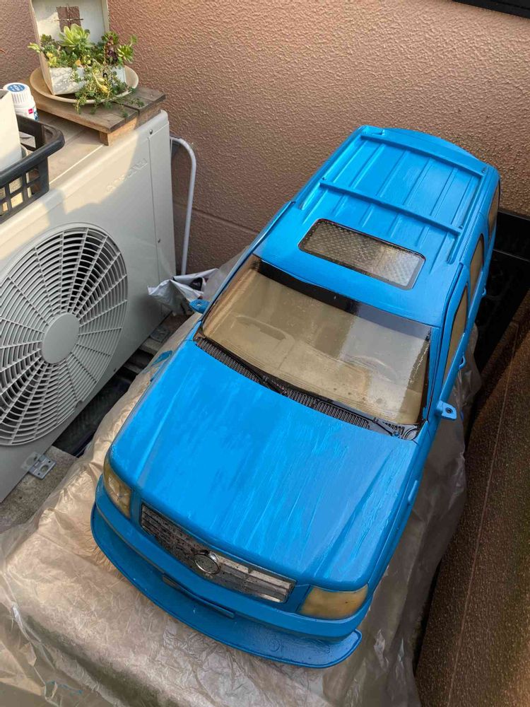 先日、不燃ごみに出しそびれ、じゃ、リニューアルしてまたお花を乗っけましょ!って事で我が家の車に近い色に塗ってる途中。