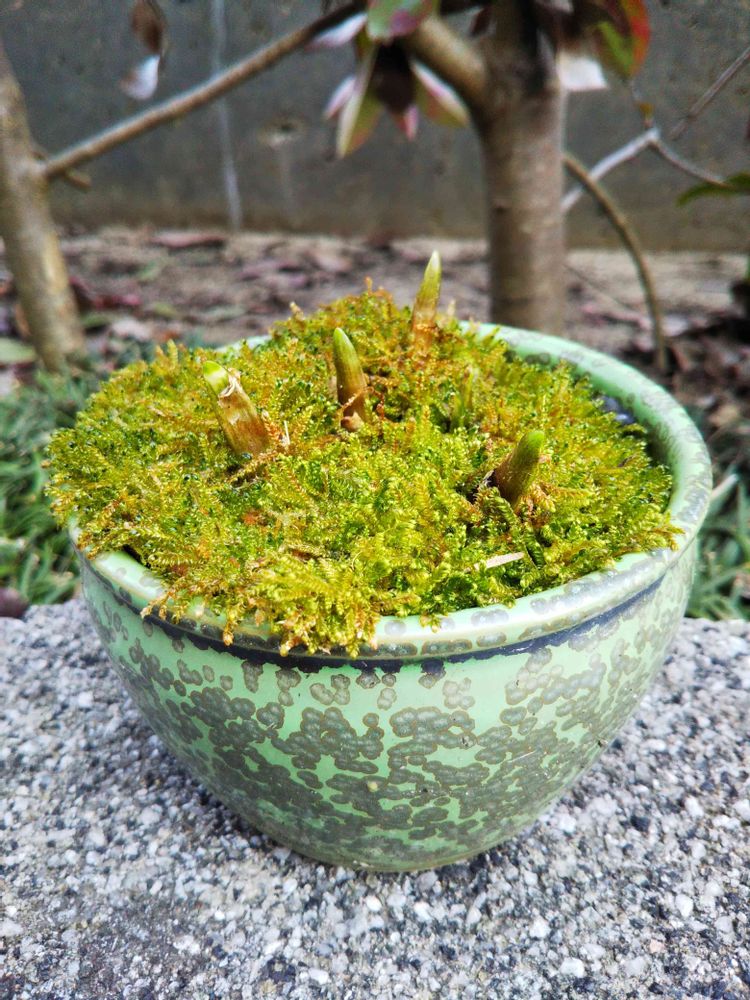 <地道投稿・自腹投稿>囲から出しました「行者ニンニク」小鉢、昨年GS投稿見てつくり二年目、しっかり苔も馴染みました。晩秋から水やりした記憶無し(雪は適当に投げ入れた)🤔今のところ五ヶ所芽が出てます。様子見て成長・場所替えアップします😊