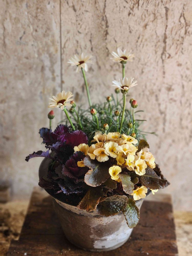 寄せ植え💛ローゼンセダムムーンは色がだんだんかわっていくみたいでプリムラと合わせてみました。あとは例のごとく渋めの葉牡丹を添えてちょっとシックに…😊