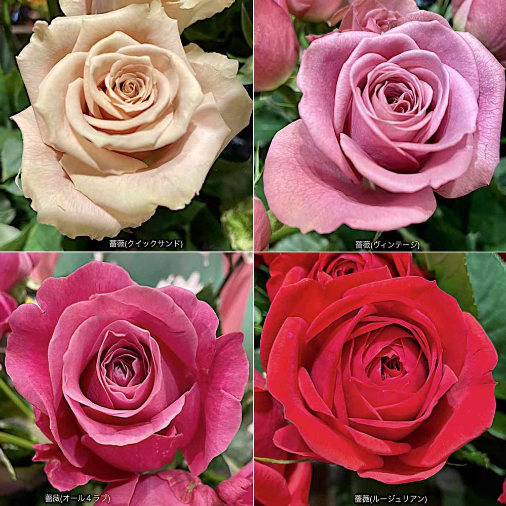 薄褐色系x1、紫系x1、ピンク系x1、赤系x1 のバラ、4つ。