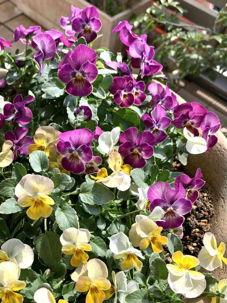ベランダのアンティークビオラが太陽にあたり気持ち良さそうに咲いています💜💛