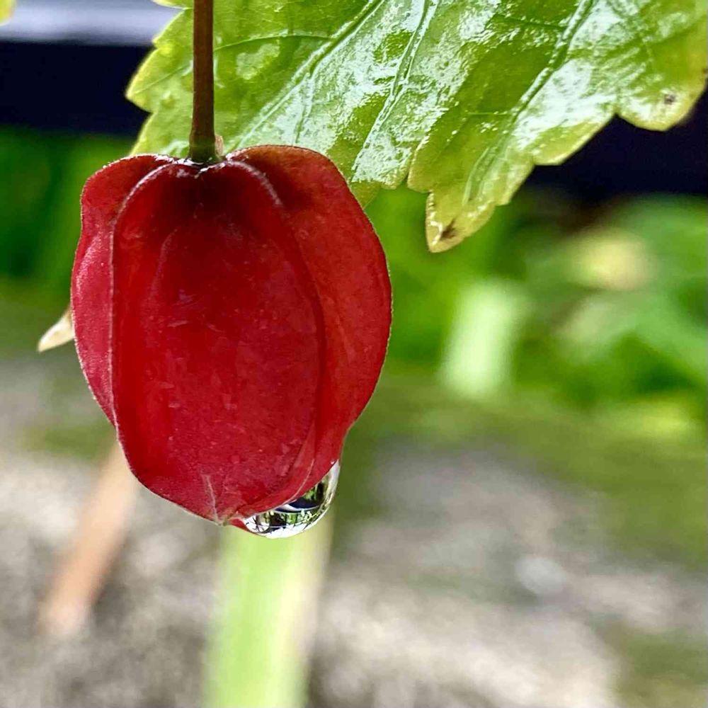 真っ赤な下向きのお花に、キラリと光る雨粒💧✨ ステキですねー❤️❤️🔴💧🔴💧