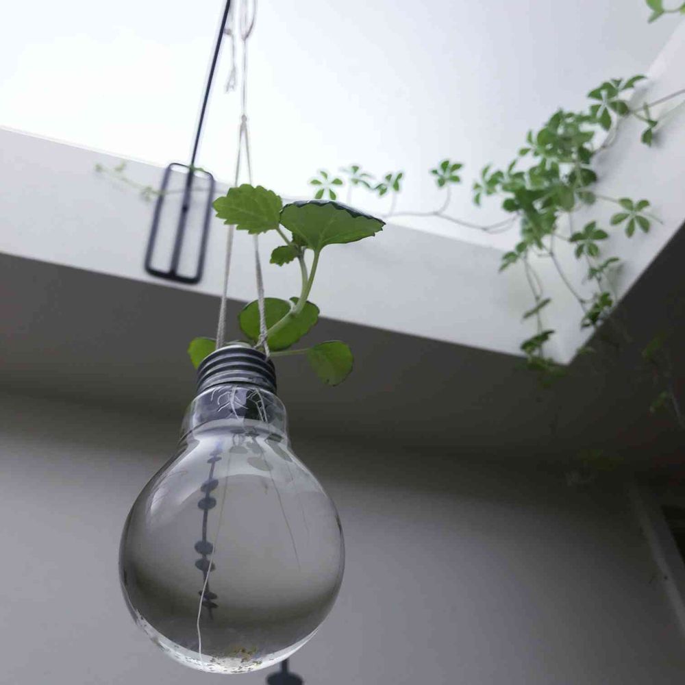 100均の電球をトントンして壊して加工した花瓶。スエーデンアイビーは水差しで増えるよ