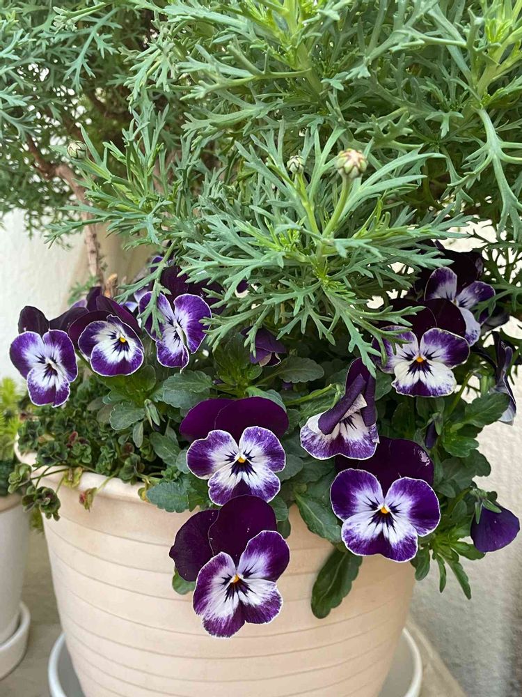 マーガレットの足元で、ビオラが咲いてます💜🤍💜