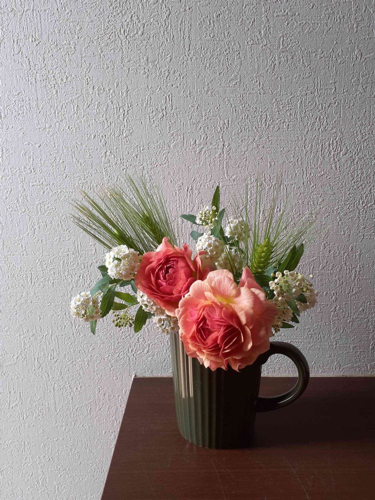 決して前のように、サイズは大きくないけれど、こじんまり とて、イキイキとした麦入る生け花。