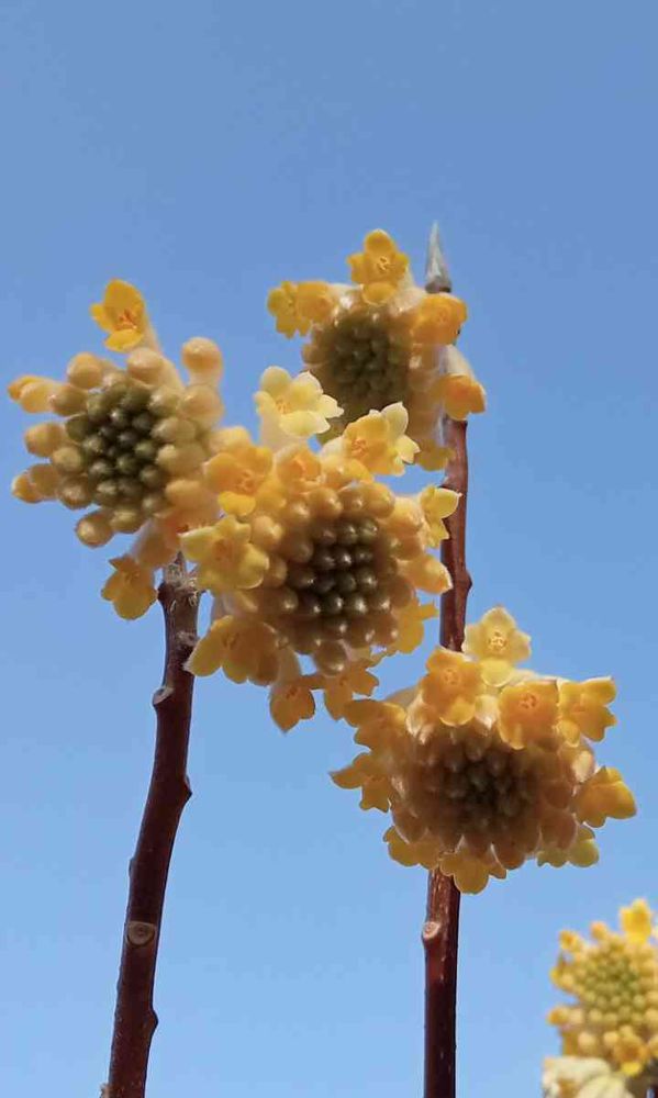 ジンチョウゲ科ミツマタ属の落葉低木。中国原産で1600年頃に渡来した。繊維が丈夫なため、コウゾ、ガンピと並ぶ三大和紙原木で和紙の原料として利用されるため栽培されるが、近年は栽培が減少し、かつて栽培されていた木が山地で野生化している場合もある。花が美しいため庭木や公園樹としても植えられる。花芽が大きいので花期以外でもよく目立つ。花期は3~4月、葉が出る前に甘い香りを放って花が咲く。黄色い花は、小さな花が30~50個集まって手鞠状になり、外から内側に咲き進む。花に花弁はなく花弁に見えるのは萼。萼筒の先は4つに開き、外側には白い絹毛が密生する。葉は長楕円形~披針形で、裏に絹毛が密生する。果実は6~7月に熟す。毛のある緑色で、枯れた萼に包まれる。