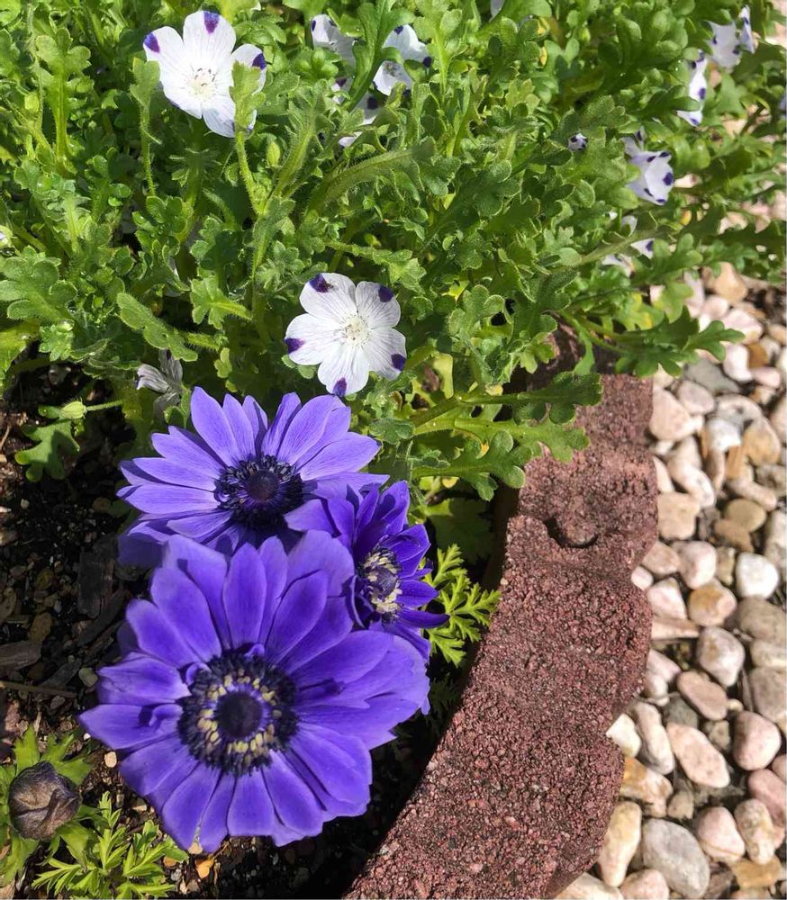 植えっぱなしの八重のアネモネと種まきからのネモフィラマキュラータです💙
