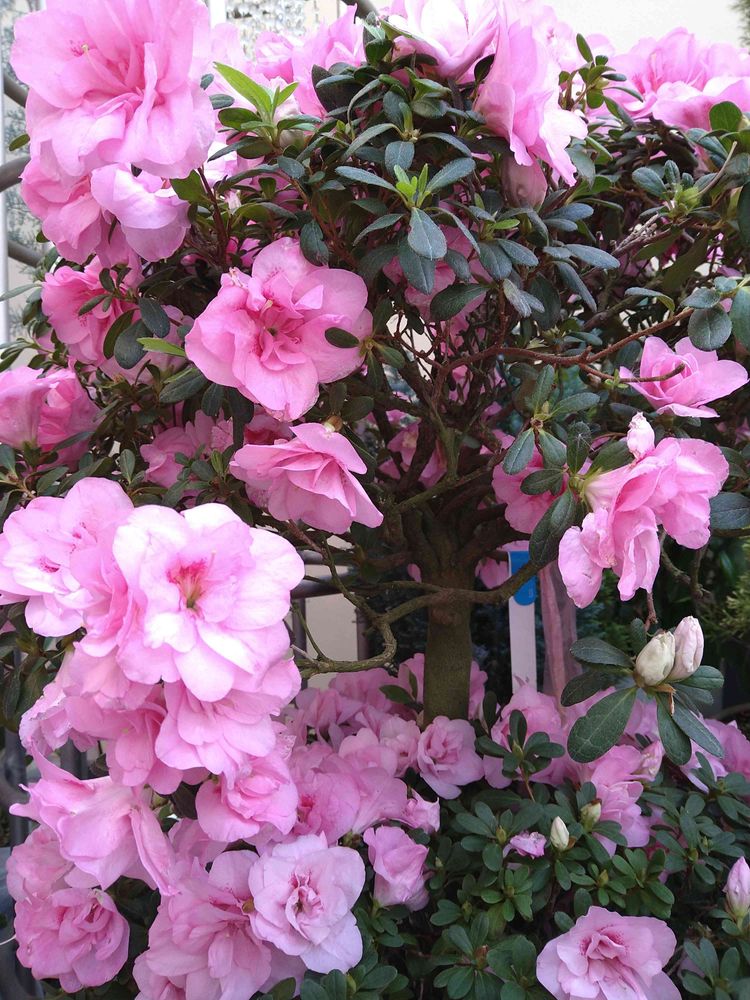大きな鉢にアザレアが植わってて、真ん中から直径4センチくらいの幹が見え、その上に同じアザレアが咲いていました😆✌️