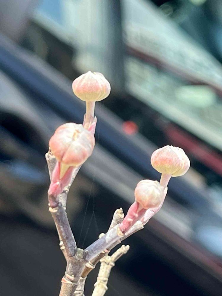 薄いピンクに色付いて、今にも開きそうな「ハナミズキ」の蕾、いや赤紫色の蕾が薄いグリーン色を帯びてきたのでしょうか?😅