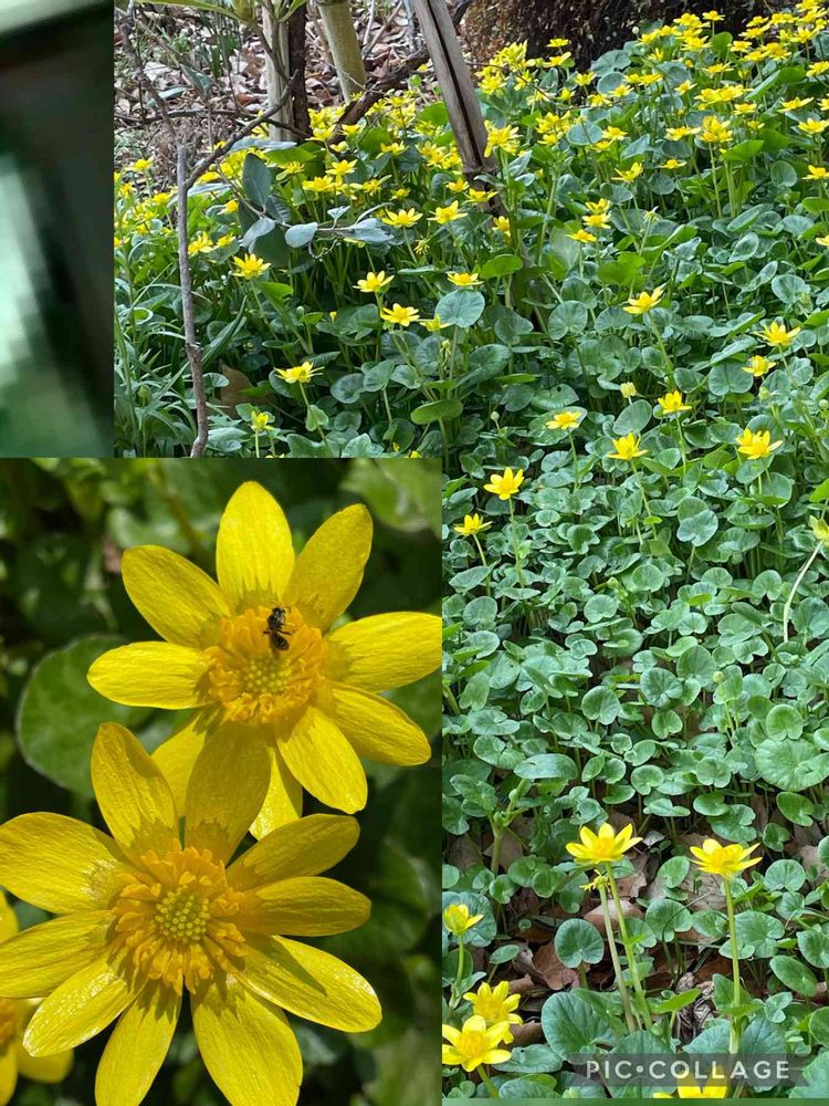 老人施設の敷地内(建物裏)の土手にヒメリュウキンカの群生が、