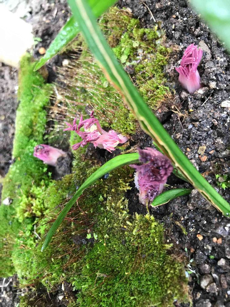 先日貼った苔の間からタイツリソウ(華鬘草)かと思う🌱新芽が出てきました。