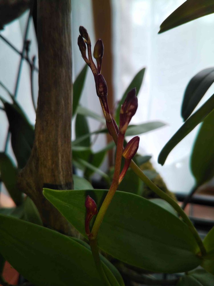 <地道投稿・自腹投稿>出窓に掛けてます「流木仕立 キンギアナム ベリーオダ」花芽伸びてきてます。晩秋から今もここに置いてます、朝陽もしっかり当たり、午前中20度にもなります。