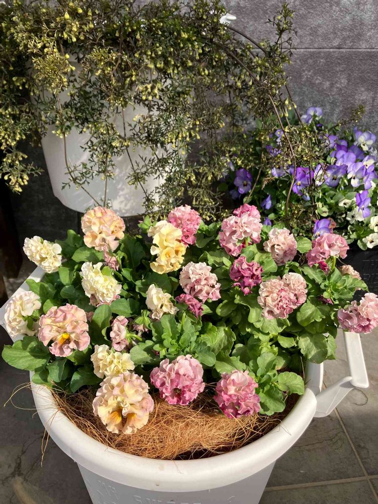 後ろに垂れ下がっているのはクレマチスのペトリエイです。クレマチスの原種で普通はツルで上に伸びますがこれは垂れ下がって小さなクリーム色の花を沢山咲かせます🍀*゜