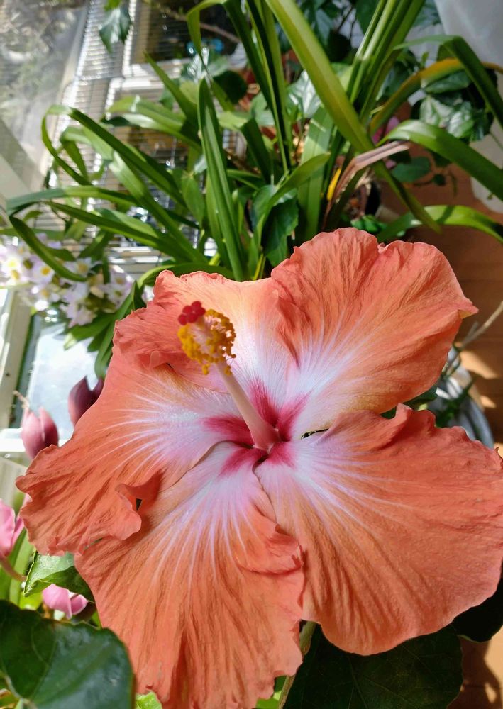 今春二花めの🧡ハイビスカスは四年目の でっかいオレンジ色(18センチも〜)が咲きました ソロソロ外に出しますね〜💕