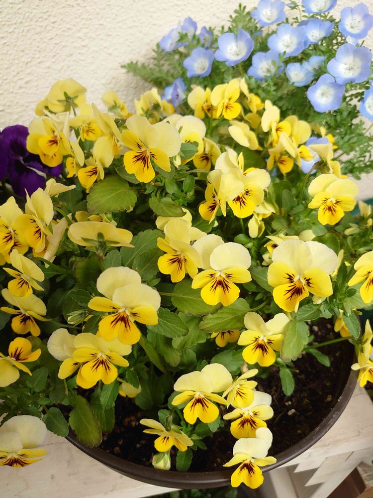 柔らかイエローのビオラとネモフィラの淡いブルーがふんわり春って感じ🎶🎶