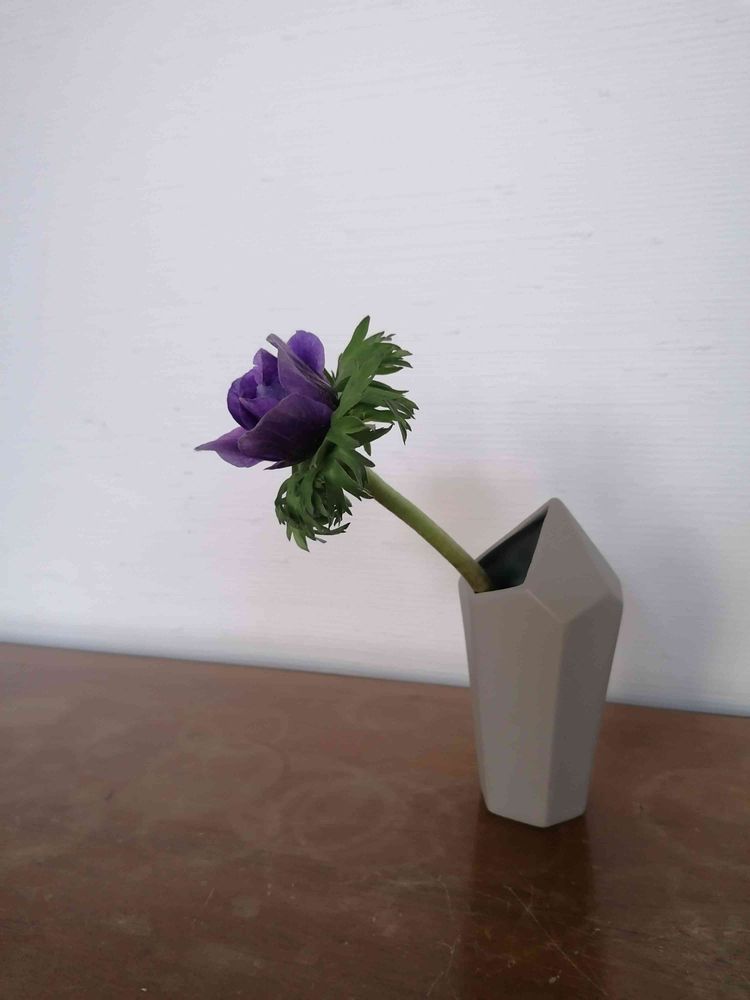 土曜日の朝、雨のふる中、歩道に一輪のアネモネがぽとり落ちていたのを娘が拾いました。笑