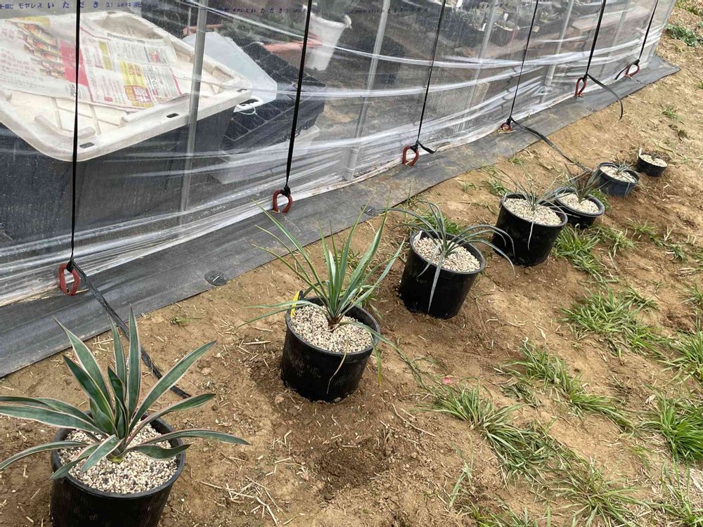 ユッカをハウス前に鉢ごと地植えしました♪早く大きくなって欲しい