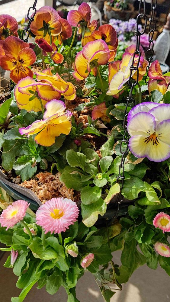 上の部分に植えた虹色スミレも、サイドのデイジーも沢山の花を咲かせて、豪華なバスケットになってきました。上からの水やりだけでは水不足 😅横からもたっぷりと💦💦
