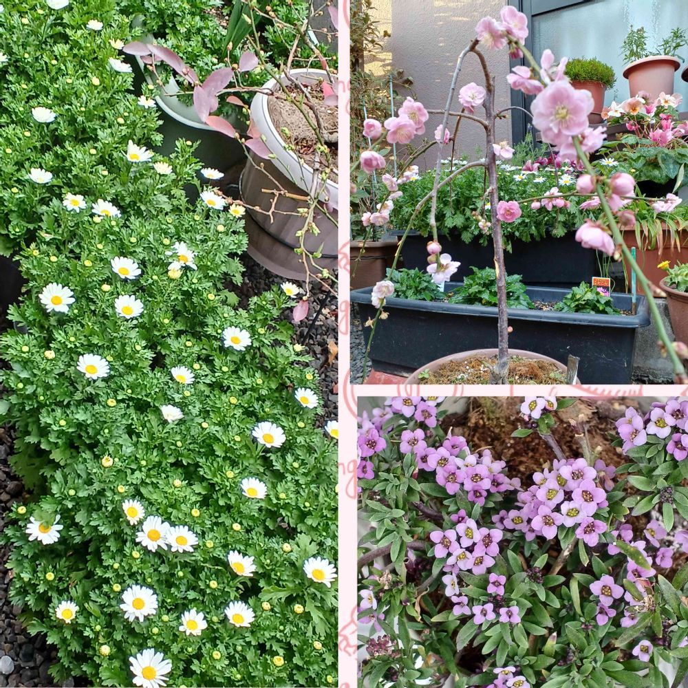 シダレ梅の盆栽、こぼれ種を集めて植えたノースポール、昨年の暮れにホームセンターで瀕死だったアリッサム、元気になりました。💠🎵