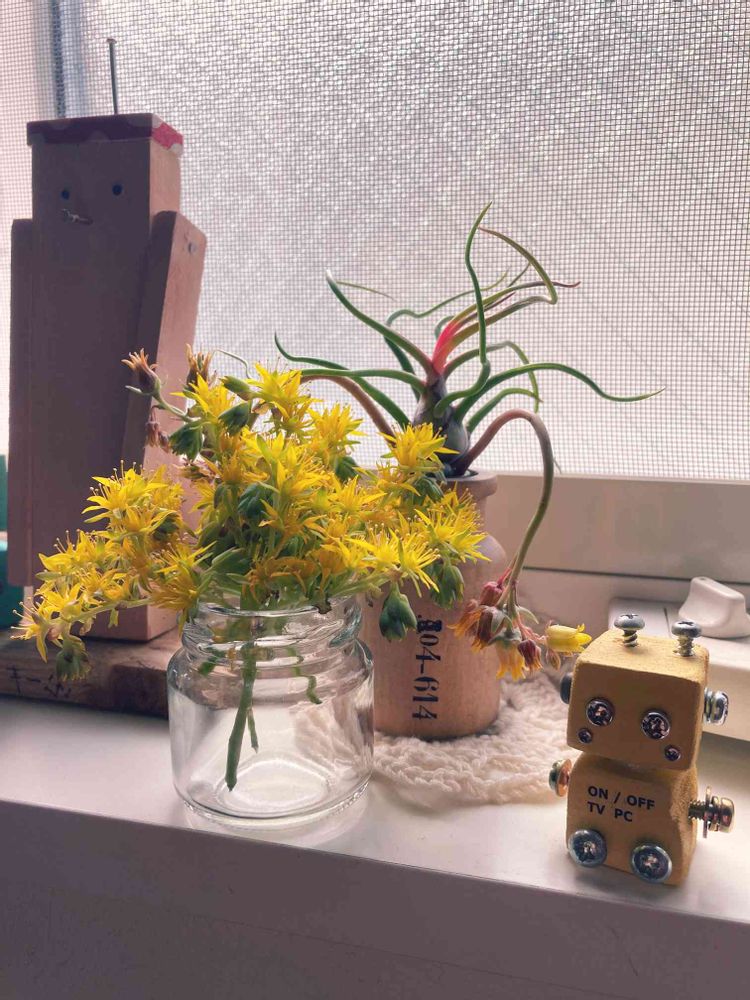 薄化粧さん、一気に咲いたから豪華でしょ🌼*・ロボたん🤖も黄色くて華やかになったよ