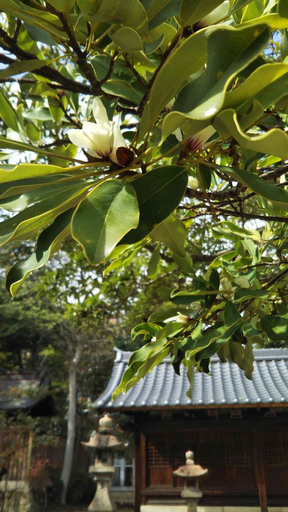 オガタマノキ(小賀玉木)の花。神社の看板では、招霊の木と書いて、オガタマノキと読ませていました。