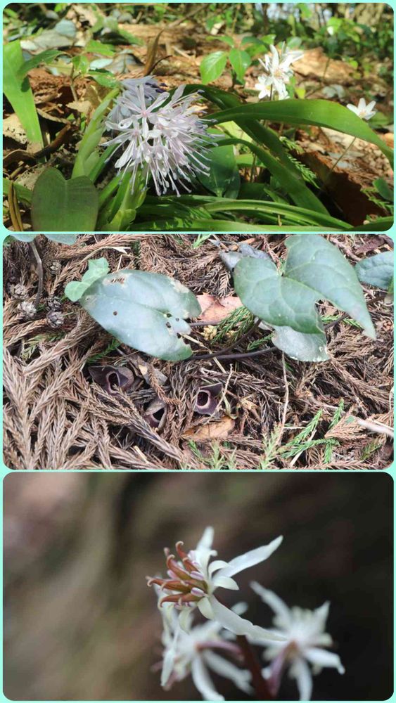 ↕️ さて、花はいくつあるでしょう⁉️。コシノカンアオイ(越の寒葵)ウマノスズクサ科カンアオイ属の常緑多年草。チョット迷い込んだ杉林。オイラは3個確認しました。わかるかナ〜。