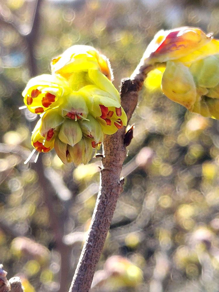 3月初め 植物園で見た「トサミズキ」の花 赤く覗かれてるのは葯と言うそうです