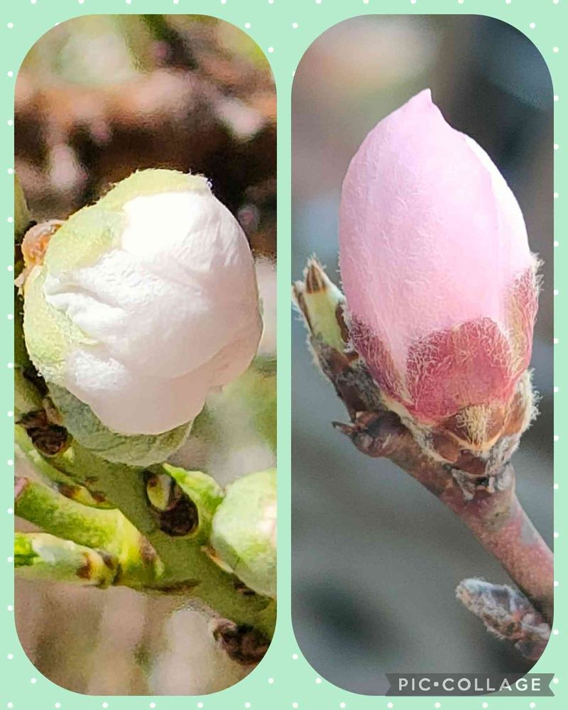 左側の白桃の蕾は母さんが食べた桃🍑を種を植えてもう10年以上毎年お花咲きます。