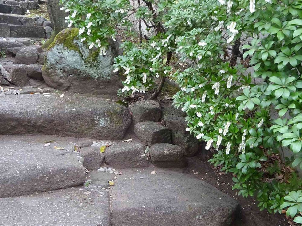 不規則に組まれた石の階段が素敵。そこに溢れるように咲くアセビの白いお花が、、