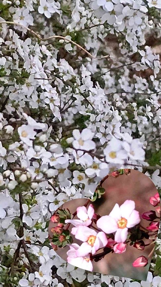 今朝、満開の庭のユキヤナギとご近所さんのピンクユキヤナギ