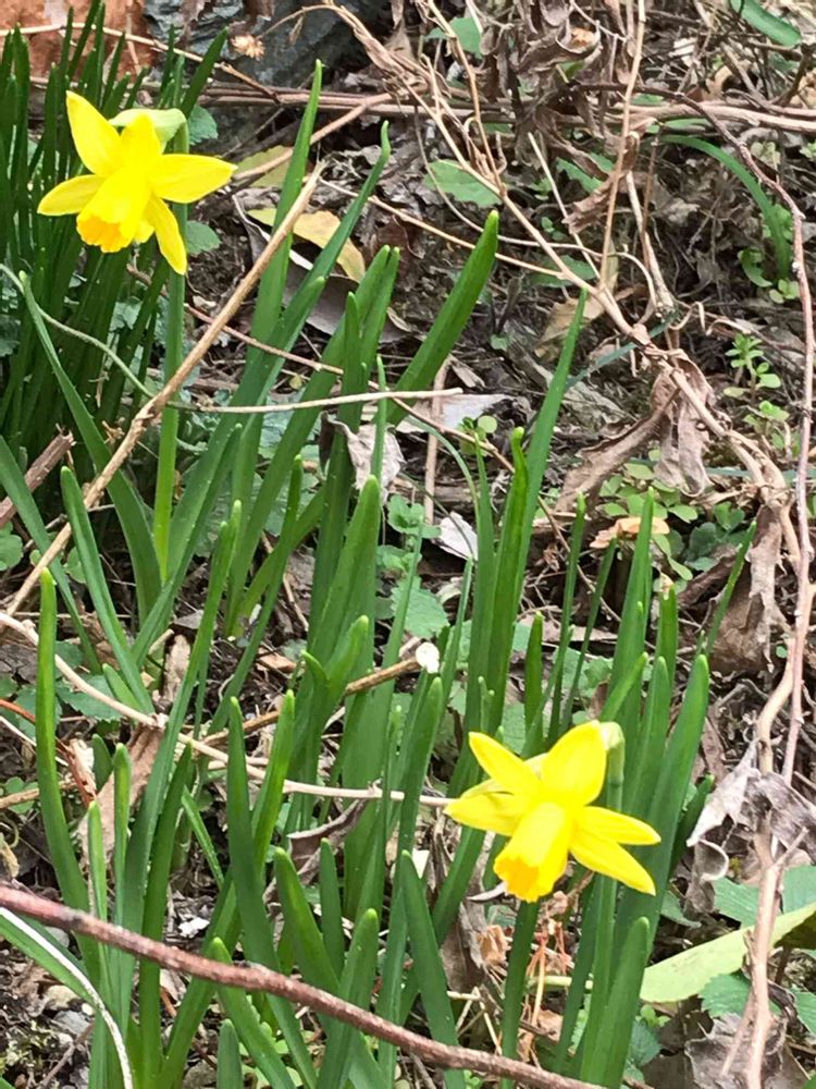ユキヤナギを見に行ったら、いつの間にかミニスイセンも二輪咲いていました。