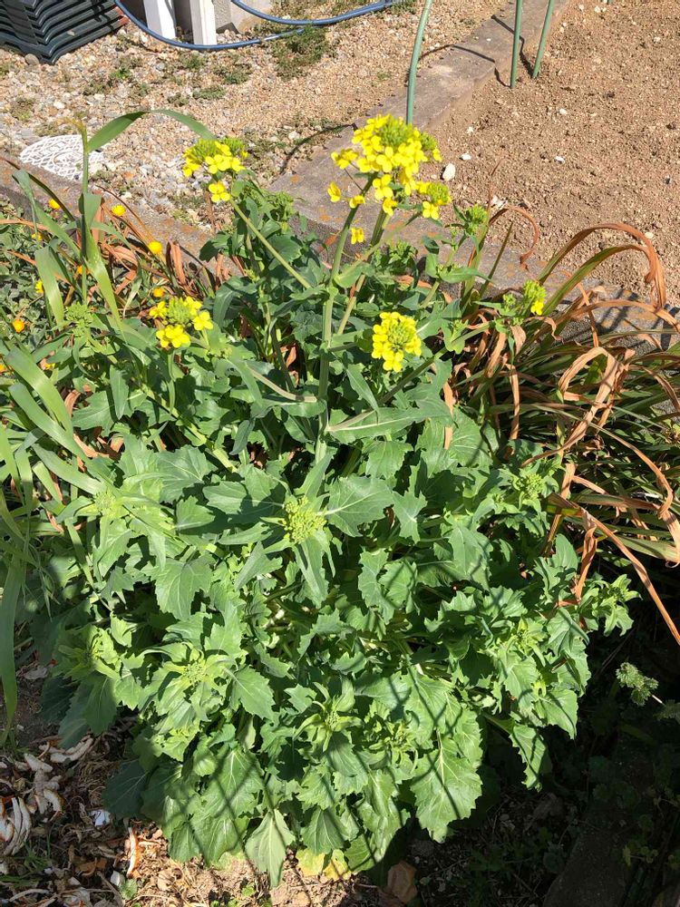 咲きましたね! 花のつき方がカブ・白菜の仲間の特徴を表しています。やっぱり水菜に近隣1kmぐらいの範囲にあるカブの花粉が掛かってタネが落ちて育ったものの可能性が高いです。この子の蕾を菜花として食べられますよ😋 良かったらお試しください!😉