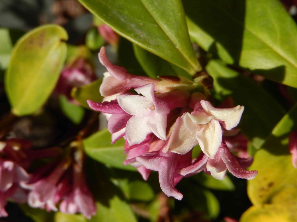 5分咲きのジンチョウゲです.鉢植えでバルコニーに置いています.今年は沢山の花がついて,程よく匂っています.