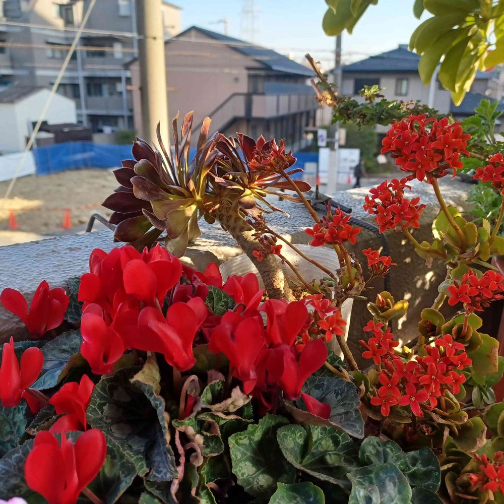 赤いガーデンシクラメンと赤いカランコエが美しいです。