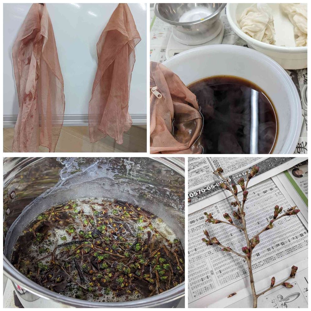 ハーブ教室で、桜の枝染めで🌸ロングショールを染めて、ベランダに乾かしています♪₍₍ ٩( *ˊ ᵕ ˋ*)و ⁾⁾♪