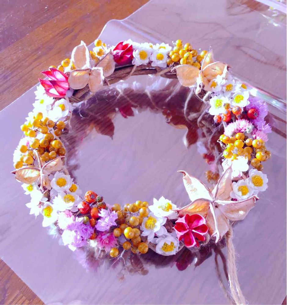 花かんざしのドライが小花で可愛いし、ちょうどリース型も作ってるのがあったし、色々ありあわせでわりと私も好きなリースになりました💕
