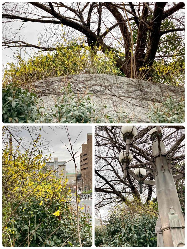 四谷見附橋の袂で「レンギョウ」の花が満開。ここの堤はソメイヨシノ桜の名所。