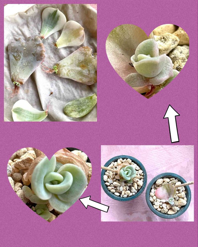 ↘️同じ方法で葉挿しした ラブリーローズ錦、みちのすけちゃん家から来た2枚とも無事に成長してる🥰