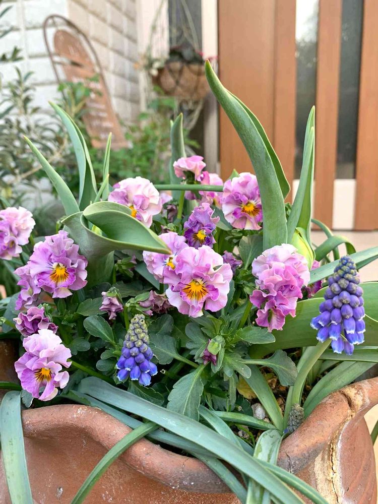 夢見るパンジーの鉢に植え込んでいましたムスカリが咲きました💙ワーイ