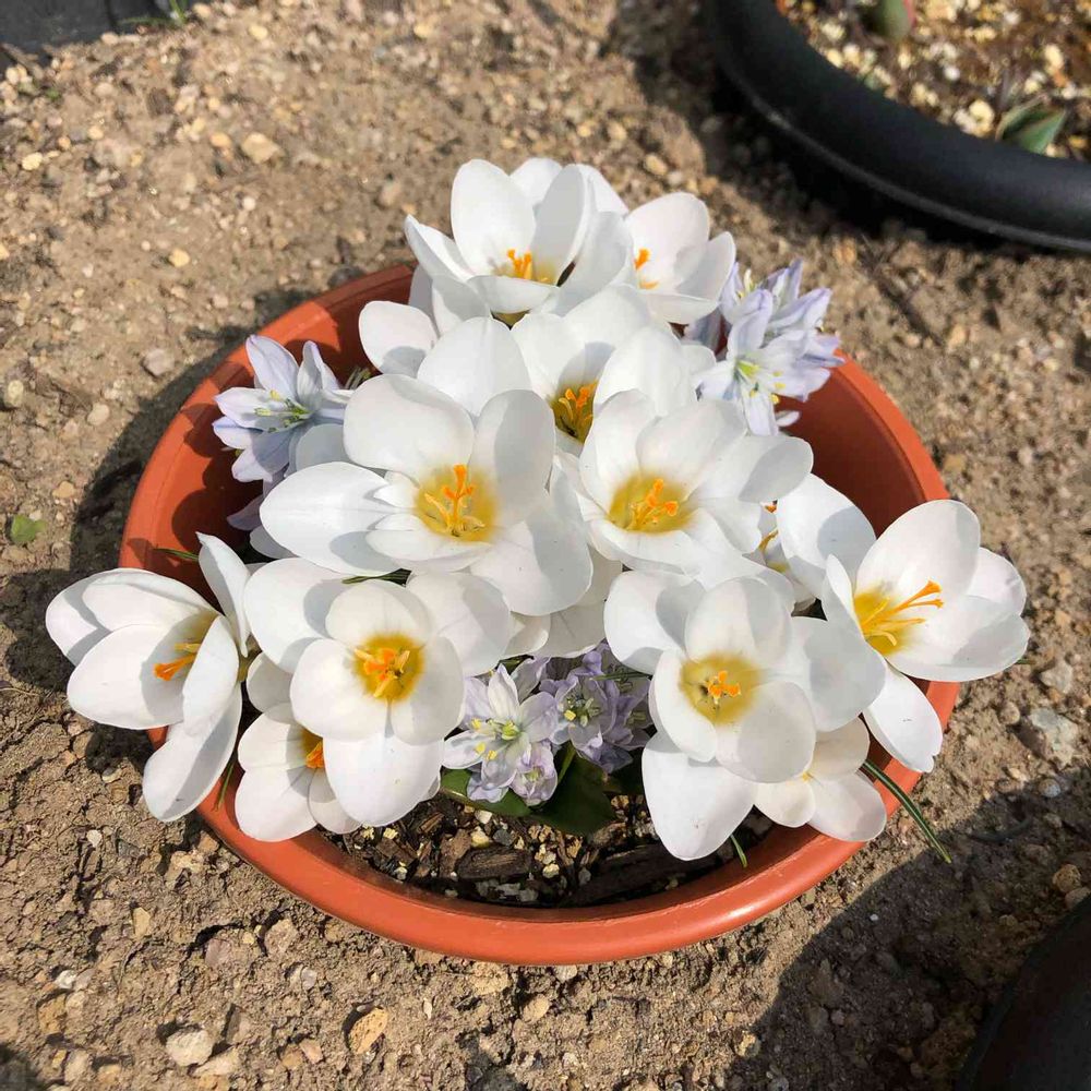 クロッカス・ミスベインとシラー・ミクストスケンコアナの寄せ植えです。