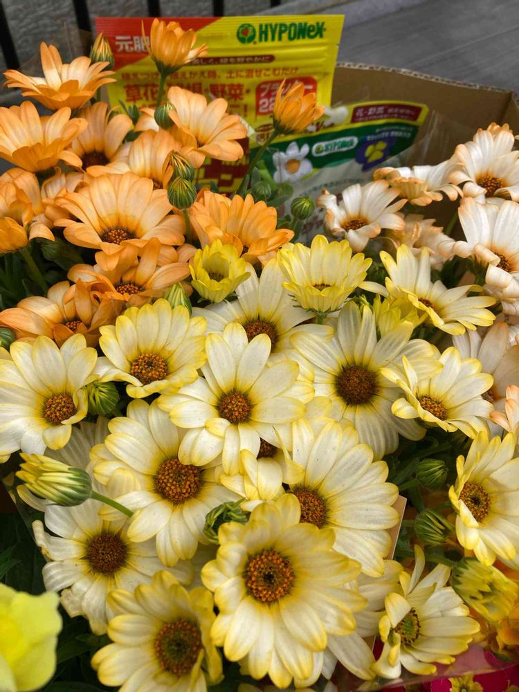 昨日 元肥を買いに 園芸屋さんへ行ったのですが 3鉢1100円の このお花💛🧡も買いました🫣 とても爽やかな色合いです🌼🌼🧡