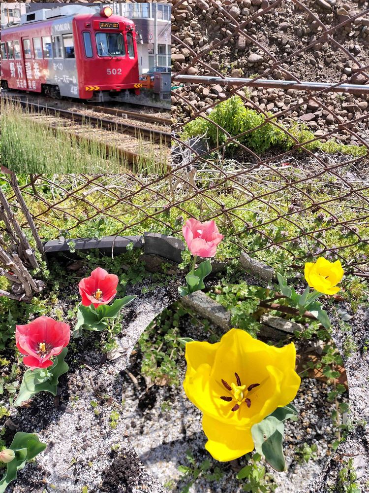 チンチン電車の線路際にかわいい💞チューリップ達🌷が〜😻🎉🌿