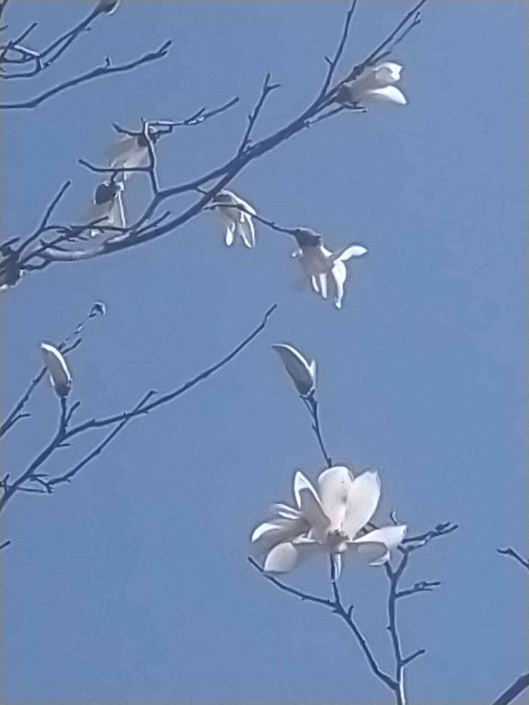 青い空を見上げると高い枝の先に春の訪れ。高くて肝心のニオイコブシの芳香も届かない!寺尾七ッ岩