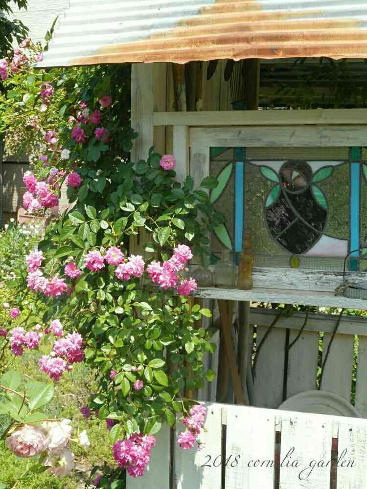 小さなシェッドに誘引した房咲き多花性のスパードロシー.*✿