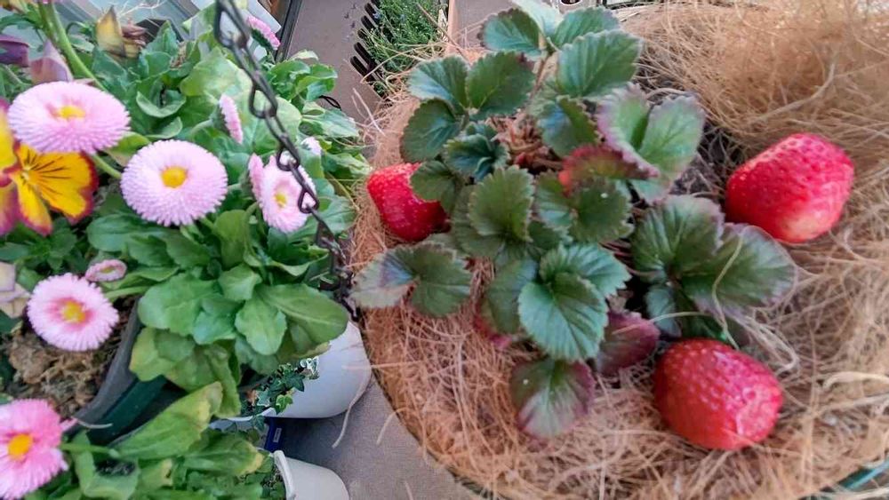 葉っぱは去年からの、宝交早生。吊り鉢で可愛いです💕
