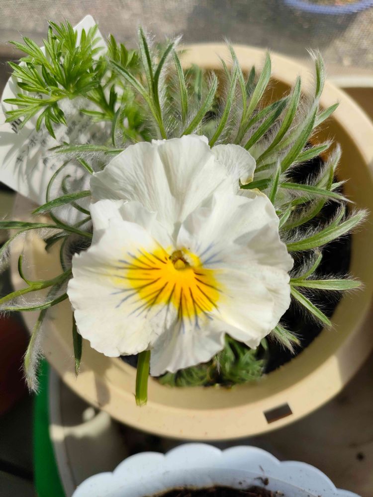 爽やかな白いパンジー🤍ですね😘葉っぱ違うのね🤭