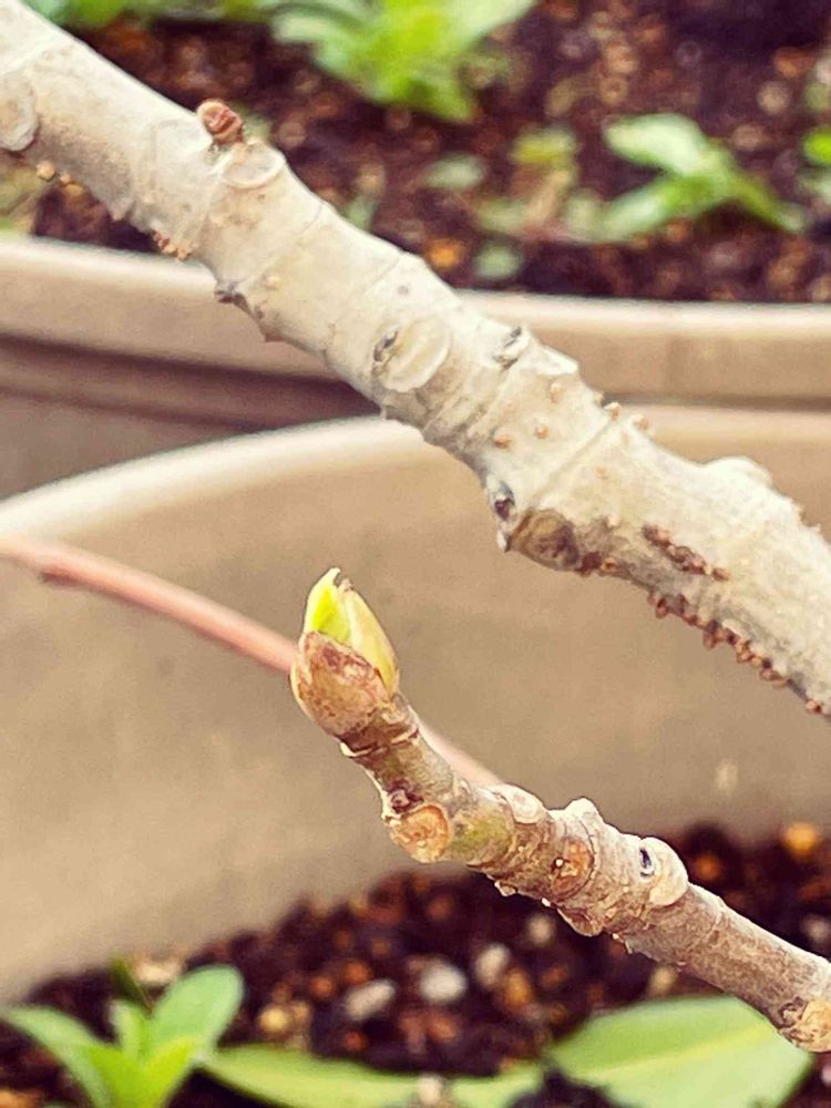 令和5年3月16日(木)🔷🔹🌥️🔹🔷晴れ おはよー^_^ございます 小さい庭の挿し木鉢のイチヂクにも🌱緑色の新芽が表れました😃
