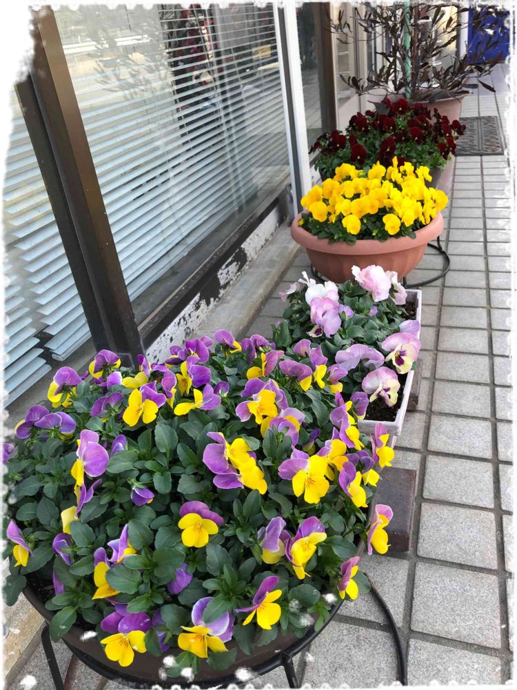 2階のベランダから、道路を通る方達に見てもらうため、店前に移動したビオラ💛💜❤️💗